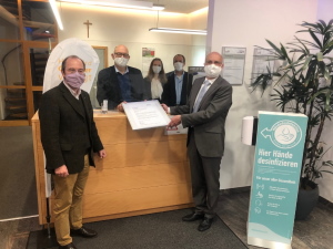 v.l.n.r.: Herr Heinz Grundner (Bürgermeister Dorfen), Herr Klaus Steiner (Geschäftsführer der Stadtwerke Dorfen GmbH) Auditorenteam der OCTOTHORPE GmbH Frau und Herr Noe und Herr Detlef Fischer (Geschäftsführer der VBEW Dienstleistungsgesellschaft mbH) freuen sich über die Wirksamkeit der getroffenen Pandemiemanagementmaßnahmen bei den Stadtwerken Dorfen und das erfolgreich absolvierte Audit.